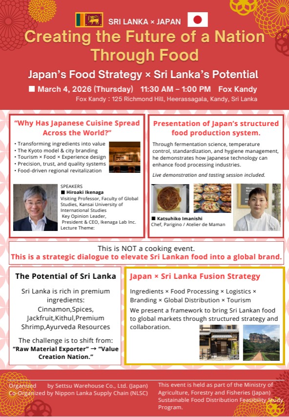 本イベントを通じて、日本の食品技術や食文化がスリランカの食産業において十分な可能性を有すること、ならびに単なるレシピ提供ではなく、食品加工・品質管理・流通を含めたサプライチェーン全体の設計が重要であることが改めて確認されました。